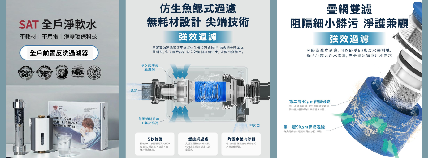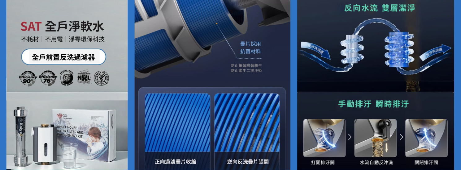 - 反洗式全戶前置過濾器:透過定期的反沖洗排污,達到不用更換濾心的目的,而且不會因為堵塞影響到水量,甚至濾濾材破裂導致有害物質的滲出,影響到水質。