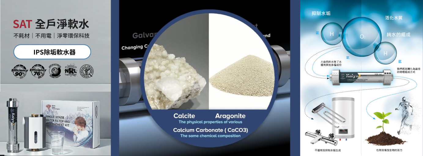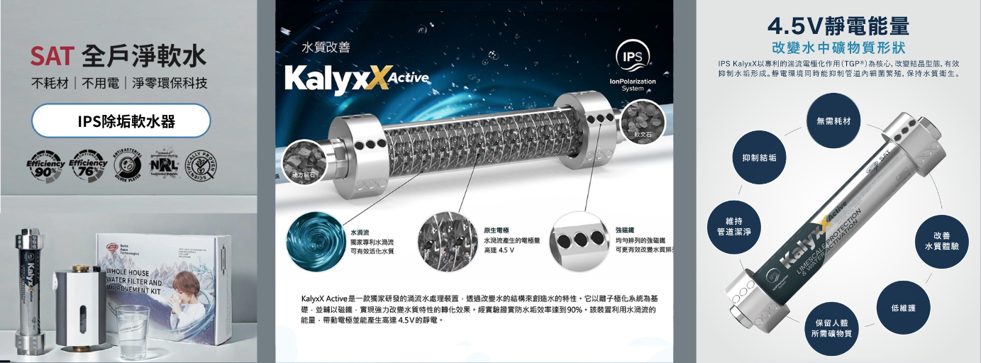 - 物理式除垢軟水器(KalyxX):國際實驗室及德國萊茵、歐盟等認證,另外他的專利技術 ( TGP®湍流電極化) ,第一個會產生湍流的現象,第二個他會產生 4.5V 的電位差,利用湍流及極化現象,以物理的模式改變水的礦物質的形狀,進而產生兩個結果,第一:抑制水垢生成的機率,從 76%至 90 %,第二:沒被水流帶走的水垢結晶,也會變成鬆散容易去除。