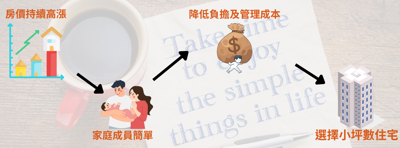 1.房價持續高漲:核心都市土地稀少與成本高,房價上升遠快於薪資成長,使得購屋者為了降低總價與貸款壓力,自然會選擇面積較小的住宅。