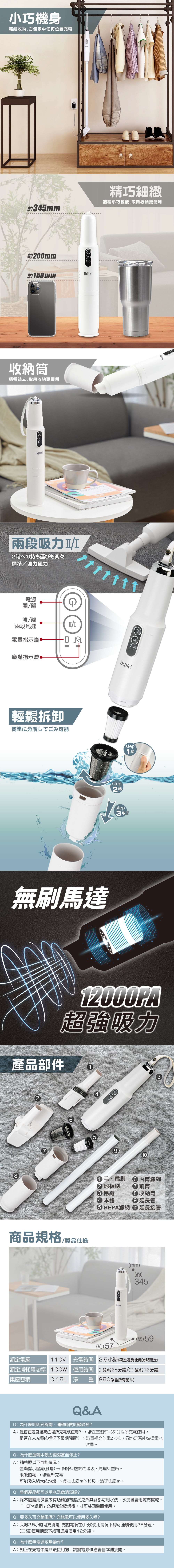 - .配件:本體、延長管x2、二合一毛扁刷、地板刷、適配器、掛繩、收納筒